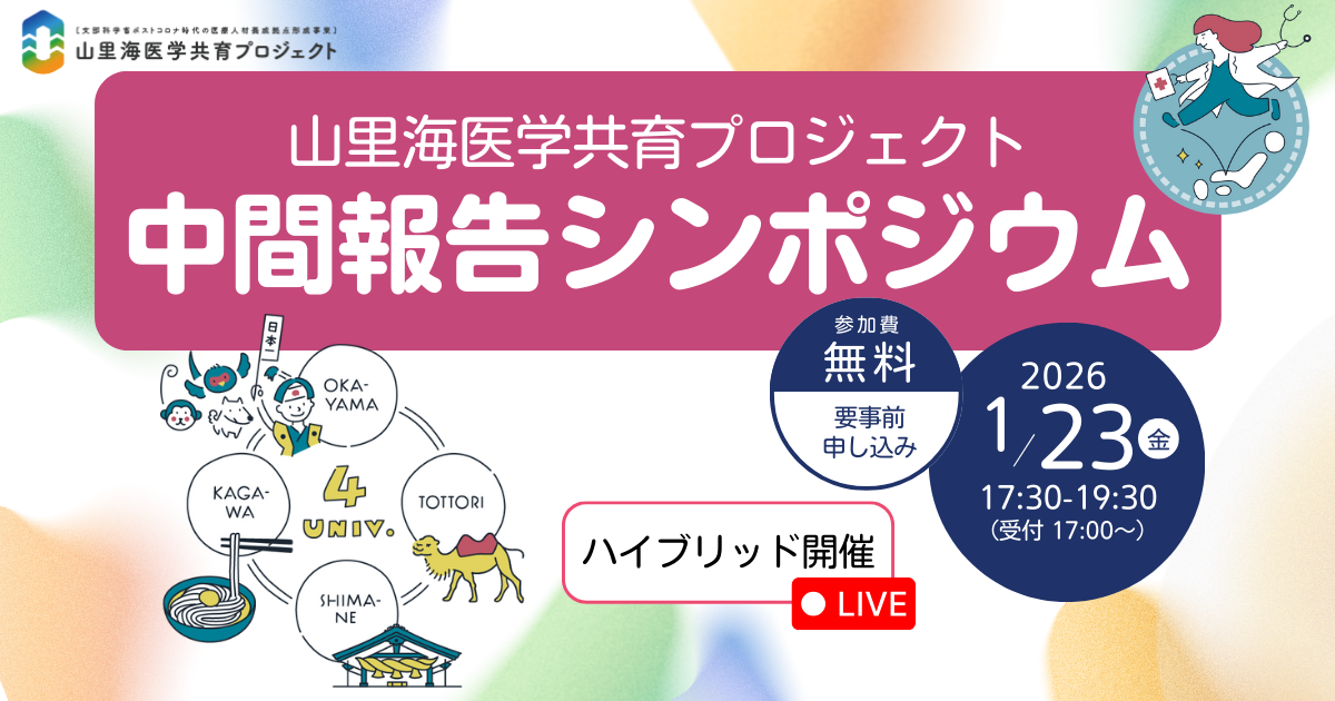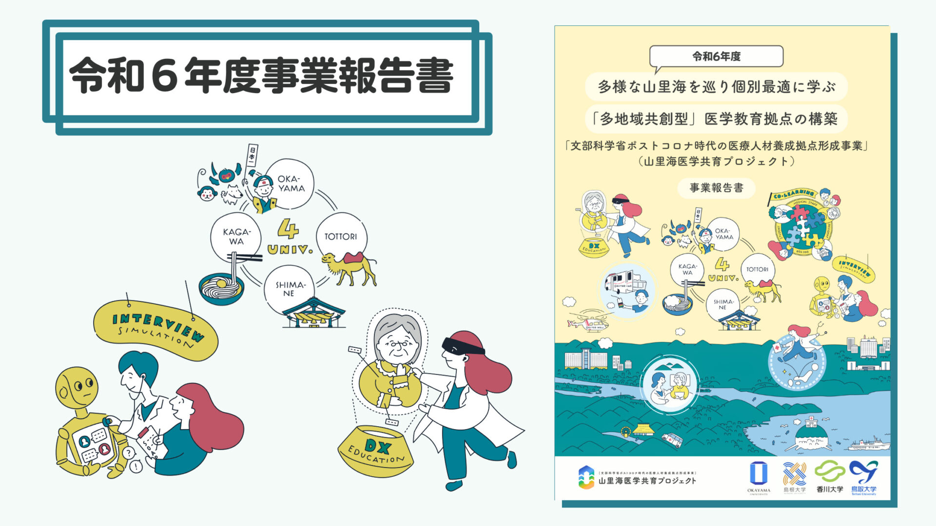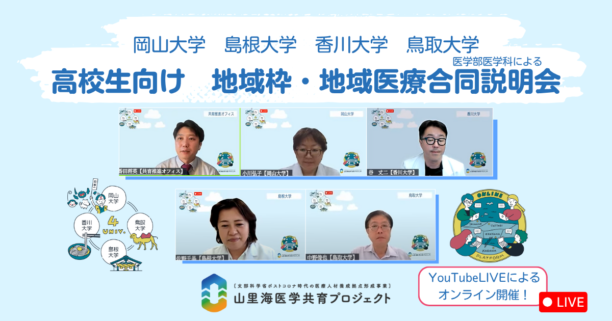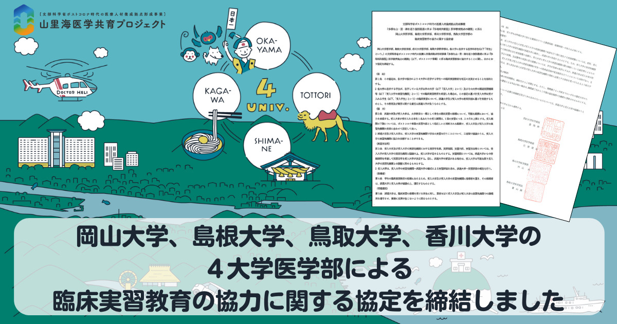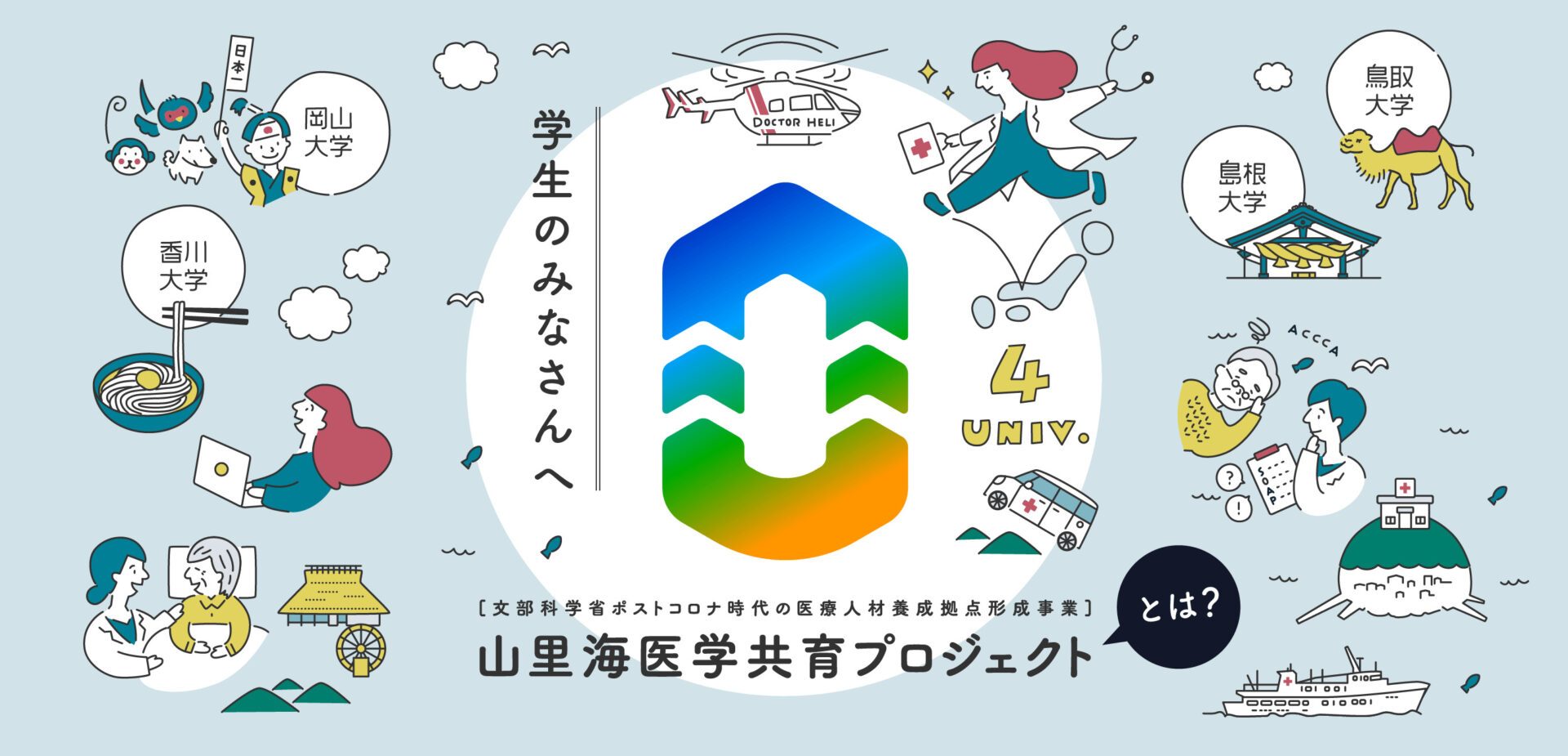 岡山大学、島根大学、鳥取大学、香川大学の4大学は、文部科学省ポストコロナ時代の医療人材養成拠点形成事業「多様な山・里・海を巡り個別最適に学ぶ『多地域共創型』医学教育拠点の構築」に選定されました。令和4年度から始まった7年間の事業です。将来の地域医療人材に求められる教育プログラムの開発・実施を行う教育拠点を構築することを目的としています。