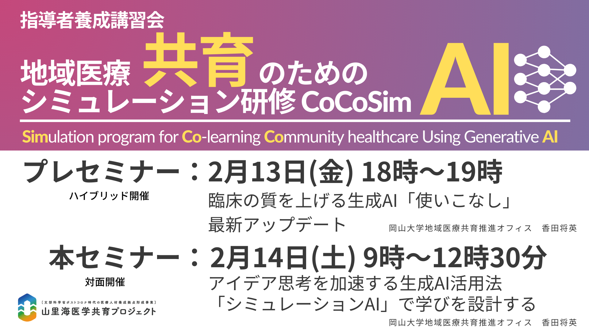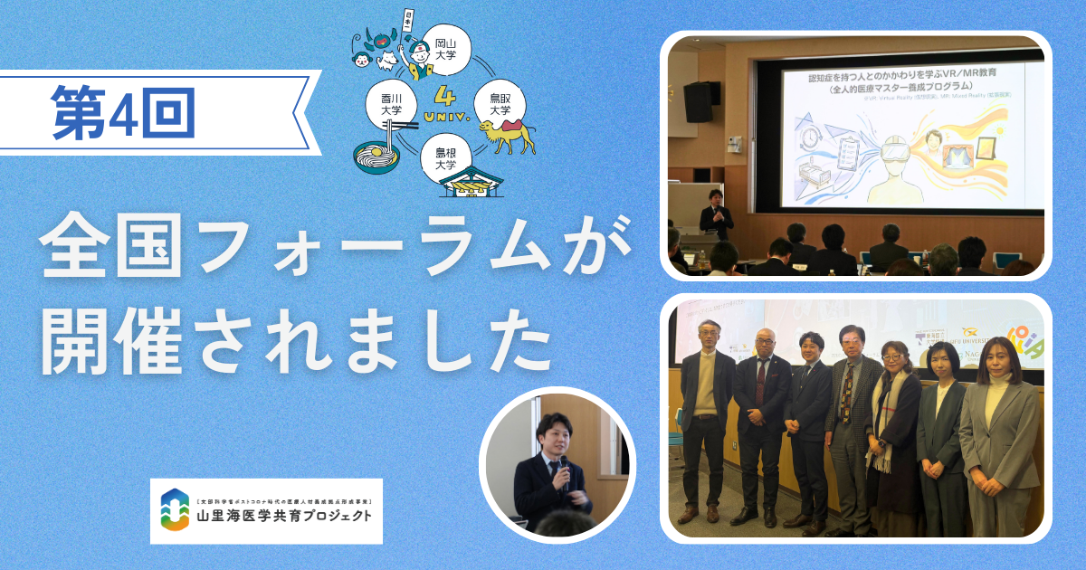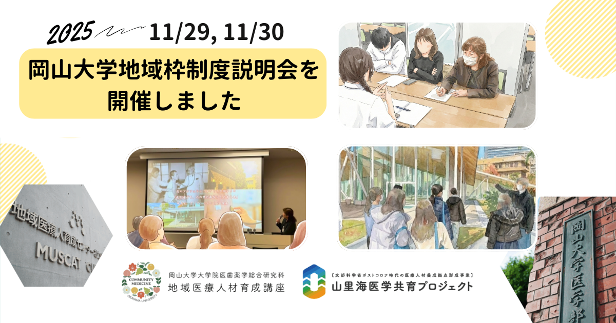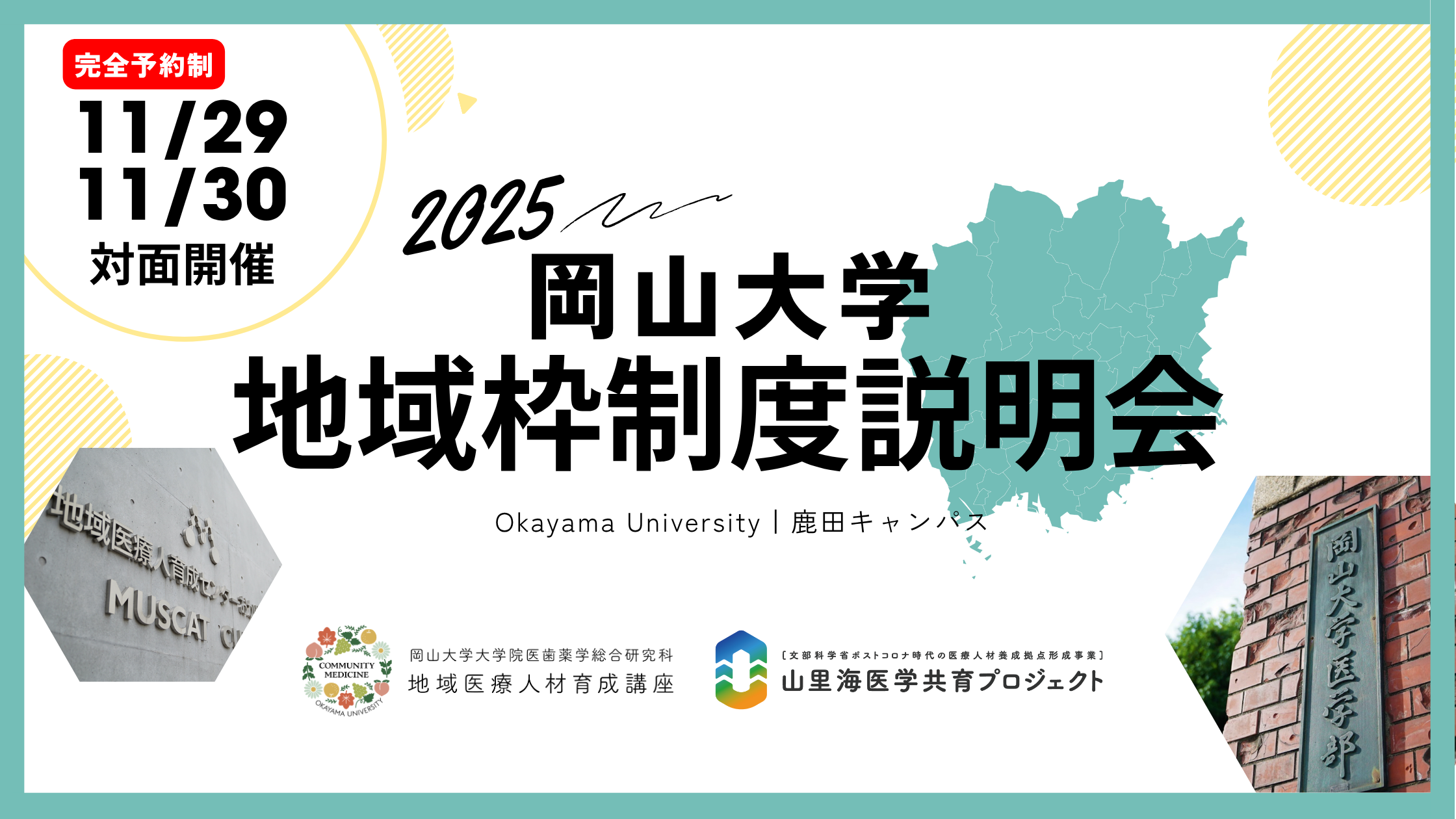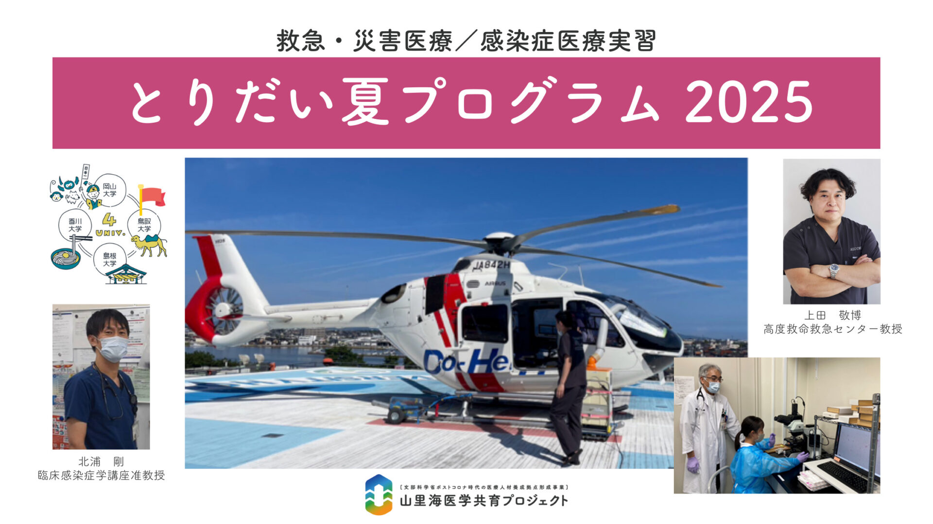 岡山大学、島根大学、鳥取大学、香川大学の4大学は、文部科学省ポストコロナ時代の医療人材養成拠点形成事業「多様な山・里・海を巡り個別最適に学ぶ『多地域共創型』医学教育拠点の構築」に選定されました。令和4年度から始まった7年間の事業です。将来の地域医療人材に求められる教育プログラムの開発・実施を行う教育拠点を構築することを目的としています。