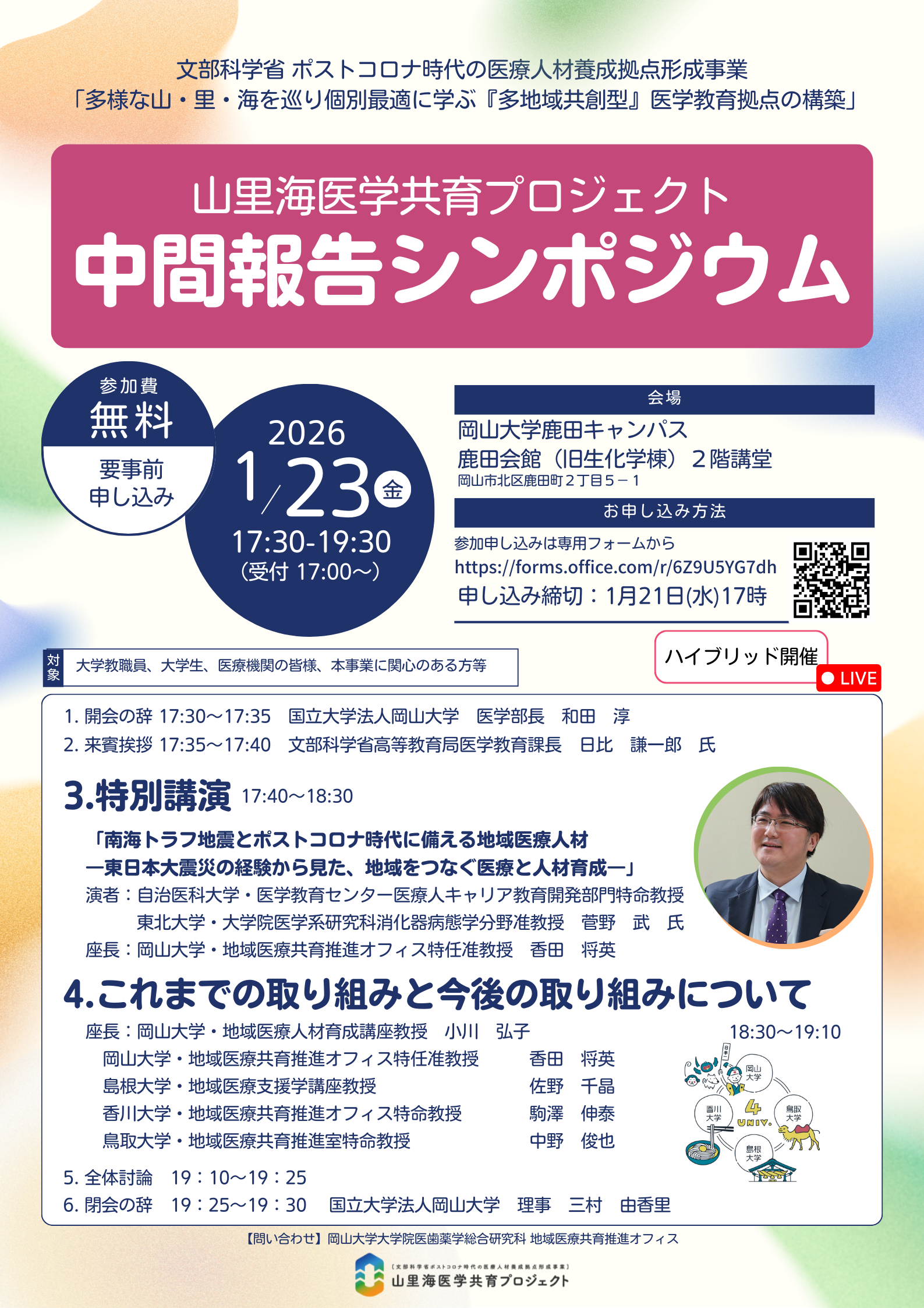 中間報告シンポジウム(岡山大学) - 日 時:令和8年1月23日(金) 17:30〜19:30(受付 17:00〜17:30)