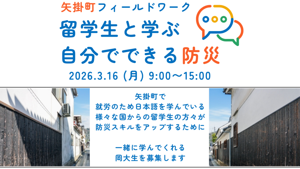 やかげ多文化共生事業プロジェクトの主催、山里海医学プロジェクトとヘルスシステム統合科学研究科看護科学の共催で、2026年3月16日(月)にフィールドワークを開催します。矢掛町で就労のために日本語を学んでいる、様々な国からの留学生の方々が防災スキルをアップするために、一緒に学んでくれる岡大生を募集します。