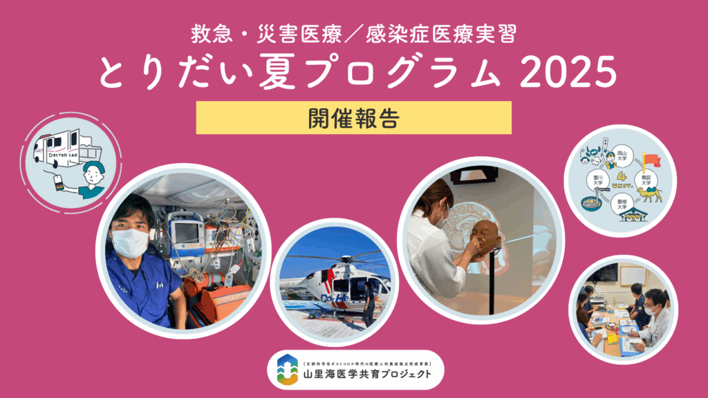 鳥取大学では山里海医学共育プロジェクトの一環として2023年度、2024年度に引き続き「2025とりだい夏プログラム」を実施しました。プロジェクトの中で鳥取大学が提供する「救急医学・災害医療学マスター養成プログラム」と「感染症学マスター養成プログラム」の内容を8月4日〜8月22日の期間に受講者の希望に合わせたスケジュールで実施し、岡山大学、香川大学、島根大学、鳥取大学から医学科、看護学科を含む1年次から5年次まで計25名の学生が参加し、多職種・多大学間での学びの場となりました。
