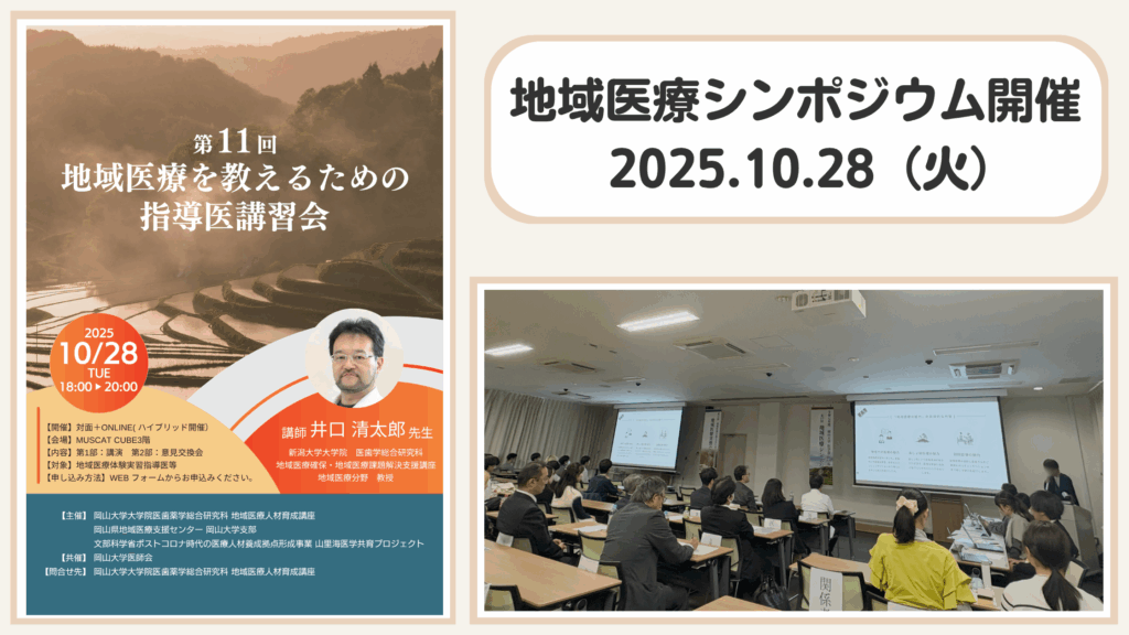 山里海医学共育プロジェクトの 地域医療 Early Exposure プログラムに位置づけられた、地域医療実習の報告シンポジウムが岡山大学MUSCAT CUBEで2025年10月28日に開催されました。岡山大学医学部医学科1年生の実習参加者と、地域医療人材育成講座との共同開催です。