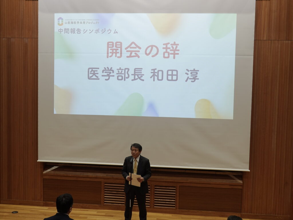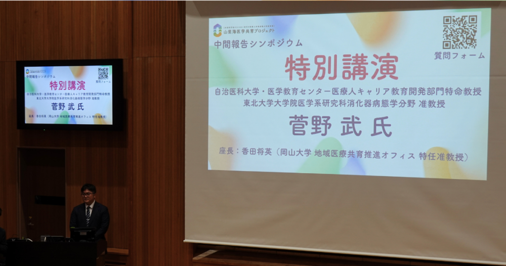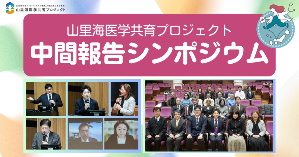 岡山大学、島根大学、香川大学、鳥取大学が連携して取り組む文部科学省 ポストコロナ時代の医療人材養成拠点形成事業「多様な山・里・海を巡り個別最適に学ぶ『多地域共創型』医学教育拠点の構築(通称:山里海医学共育プロジェクト)」は、2026年1月23日に中間報告シンポジウムを岡山大学鹿田会館・講堂で開催しました。