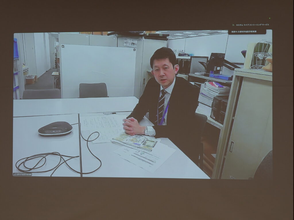 はじめに、和田 淳 岡山大学医学部長 による開会の辞があり、続いて文部科学省高等教育局医学教育課長 日比 謙一郎 氏より来賓挨拶をいただきました。来賓挨拶では、本事業が全国11拠点で展開されており4年目を迎えること、大学の枠を超えた連携が教員・学生の刺激となり知見の活用につながること、成果を広く発信し年度末の目標達成に向けて引き続き取り組んでほしいとの期待が述べられました。